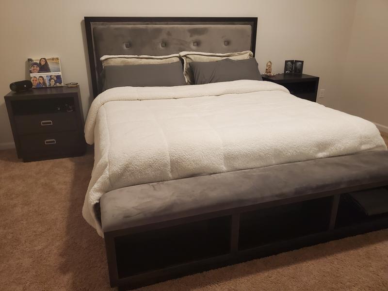 The upholstered headboard is designed to work with a low profile storage footboard.